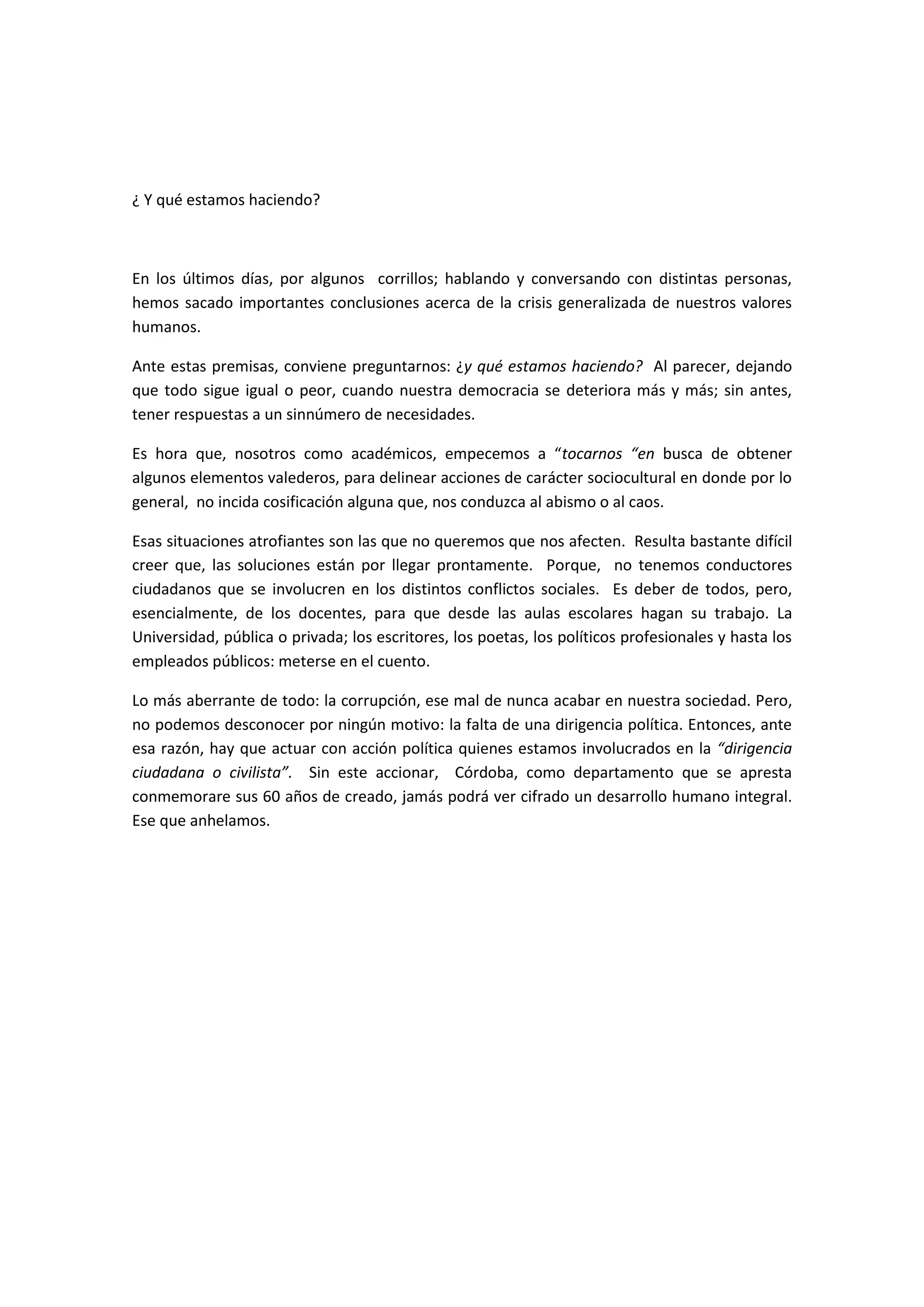 El documento argumenta que debemos preguntarnos qué estamos haciendo mientras nuestra democracia se deteriora y tenemos un sinnúmero de necesidades insatisfechas. Insta a académicos y otros líderes ciudadanos a involucrarse en conflictos sociales y acciones socioculturales para abordar problemas como la corrupción y la falta de liderazgo político, a fin de lograr un desarrollo humano integral en Córdoba.