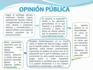 El documento resume las definiciones y evolución histórica de la opinión pública. Define la opinión pública como un conglomerado de puntos de vista diversos que se expresan públicamente, influenciados por factores como la clase social. Explica que la imprenta y los medios modernos han permitido que la opinión pública se exprese a mayor escala e influya en asuntos políticos y sociales.