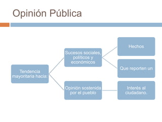 Este documento trata sobre la opinión pública. Define la opinión pública como la tendencia mayoritaria del pueblo hacia sucesos sociales, políticos y económicos de interés al ciudadano. Explora la evolución histórica del concepto desde la antigua Grecia hasta la actualidad, incluyendo el surgimiento de los medios de comunicación masiva y su influencia. También resume las perspectivas de varios autores como Luhmann, Habermas, Noelle Neumann y Rousseau sobre la definición y función de la opinión pública.