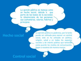 La opinión pública es un hecho social que se forma a partir de la cultura e ideología de una sociedad y puede ser usada para ejercer control social a través de los medios de comunicación. A través de la historia, la opinión pública ha ido ganando importancia desde la antigua Grecia y Roma, impulsada por la aparición de la imprenta y los medios masivos en los siglos XIX y XX. La opinión pública interpela con la ideología al cuestionar si los hechos concuerdan con las ideas fundamentales de una