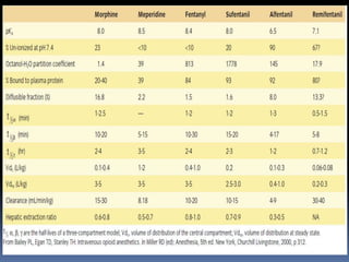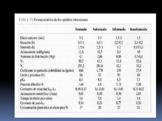 El documento resume los puntos clave sobre los opioides, incluyendo su historia, mecanismo de acción, efectos farmacológicos y farmacocinética. Los opioides suprimen el dolor actuando en el cerebro, médula espinal y sistema nervioso periférico a través de los receptores mu, kappa y delta. Su efecto analgésico se debe a mecanismos locales en la médula espinal, donde disminuyen la liberación de taquicinina. Sin embargo, también producen efectos adversos como depresión respiratoria,