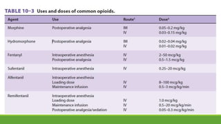Este documento resume la historia y clasificación de los compuestos opioides, incluyendo los receptores opioides, péptidos endógenos y propiedades farmacodinámicas. Los sumerios cultivaban la adormidera hace 5.000 años para fines medicinales. En el siglo XIX se comenzó a usar la morfina durante intervenciones quirúrgicas en guerras. Existen cuatro tipos principales de receptores opioides y tres tipos de péptidos endógenos que interactúan con ellos. Los opioides producen analgesia al im