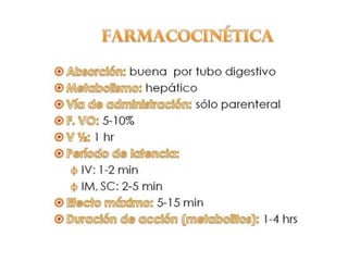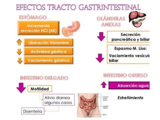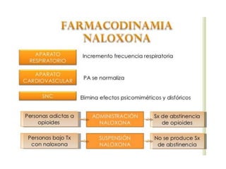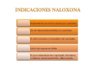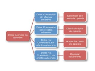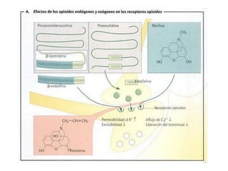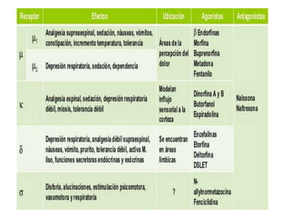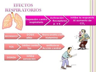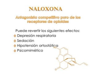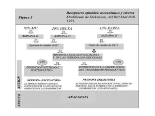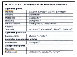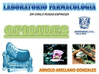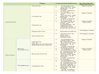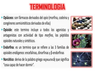 El documento proporciona información sobre los opioides, incluyendo su origen, mecanismo de acción, efectos y clasificación. Los opioides son sustancias naturales o sintéticas que se unen a los receptores de opioides en el cerebro y producen efectos analgésicos y de euforia. Algunos opioides comunes son la morfina, la codeína y la heroína.