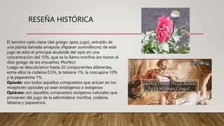 El documento trata sobre los opioides. Explica que los opioides son compuestos naturales o sintéticos que actúan en los receptores opioides del sistema nervioso central y periférico, provocando analgesia y otros efectos. Describe los principales opioides como la morfina, codeína, metadona y fentanilo, y resume sus mecanismos de acción, usos terapéuticos, efectos adversos y tolerancia.