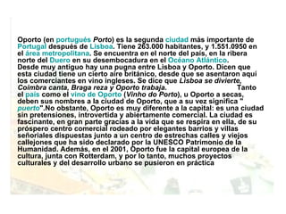 Oporto es la segunda ciudad más importante de Portugal con una población de 263,000 habitantes y una rica historia que data de un asentamiento griego llamado Cale. La ciudad, conocida por su ambiente comercial y cultural, fue nombrada en honor a su puerto y ha sido declarada Patrimonio de la Humanidad por la UNESCO. Además, en 2001 fue nombrada Capital Europea de la Cultura junto con Rotterdam.