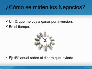Este documento presenta diferentes opciones de inversión y negocios, y promueve la compañía Amway como una alternativa atractiva. Discute los posibles rendimientos de invertir en CDTs, propiedades, la bolsa de valores y un negocio tradicional, y argumenta que Amway ofrece mayores ganancias con menos riesgo. También describe diferentes niveles de inversión en Amway y cómo construir un negocio de múltiples niveles para ganar comisiones sobre las ventas de otros.
