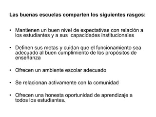 El documento describe las características de las buenas escuelas, incluyendo mantener altas expectativas de los estudiantes, definir metas claras, ofrecer un ambiente escolar adecuado, involucrar a la comunidad, y brindar oportunidades de aprendizaje a todos los estudiantes. También discute factores que facilitan el aprendizaje, como información clara, práctica reflexiva, retroalimentación y motivación. Finalmente, propone ampliar las experiencias de los estudiantes, aumentar sus opciones, y hacer que la escuela