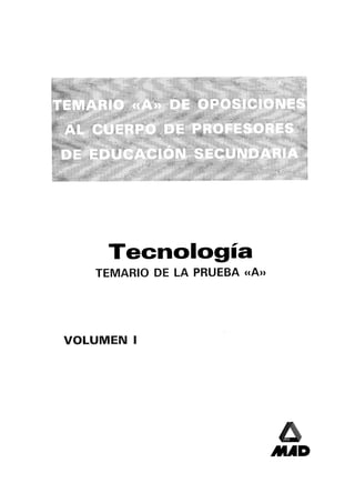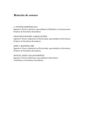 Este documento presenta la relación de autores de un libro de temario para oposiciones a profesor de educación secundaria de la especialidad de tecnología. Los cuatro autores son ingenieros técnicos y profesores de enseñanza secundaria. El documento también incluye una presentación del libro que describe su objetivo de proporcionar todo el material necesario para la preparación de las oposiciones de manera clara y sistemática.