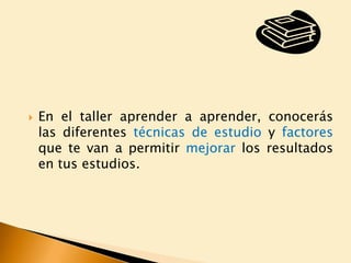 El taller de aprender a aprender enseña diferentes técnicas de estudio para mejorar los resultados académicos. En cada sesión, los estudiantes aprenderán habilidades de estudio como organizar su tiempo, concentrarse mejor, y prepararse para exámenes usando técnicas como subrayar, esquemas y resúmenes. El objetivo es mejorar la calidad del aprendizaje de los estudiantes.
