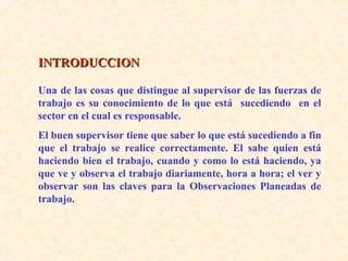 El documento describe el proceso de Observaciones Planeadas de Trabajo (OPT) que los supervisores usan para observar sistemáticamente el trabajo de los empleados. El objetivo de las OPT es controlar y mejorar los estándares establecidos para aumentar la seguridad, productividad y calidad. El proceso incluye seleccionar al trabajador y tarea a observar, prepararse con los Procedimientos Establecidos de Trabajo, observar al trabajador sin distraerlo, realizar una revisión posterior con él, y una observación