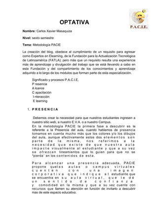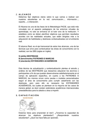 El documento describe la metodología PACIE (Presencia, Alcance, Capacitación, Interacción, E-learning) para el diseño de cursos en línea. Explica que cada fase de la metodología aborda un aspecto diferente del diseño de cursos como la imagen y navegabilidad del sitio, los objetivos del curso, la capacitación de los profesores y el uso de herramientas para promover la interacción y el aprendizaje en línea.