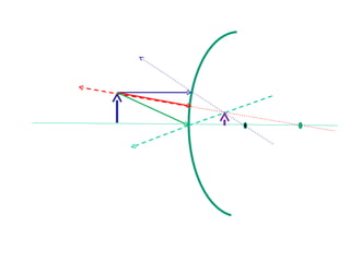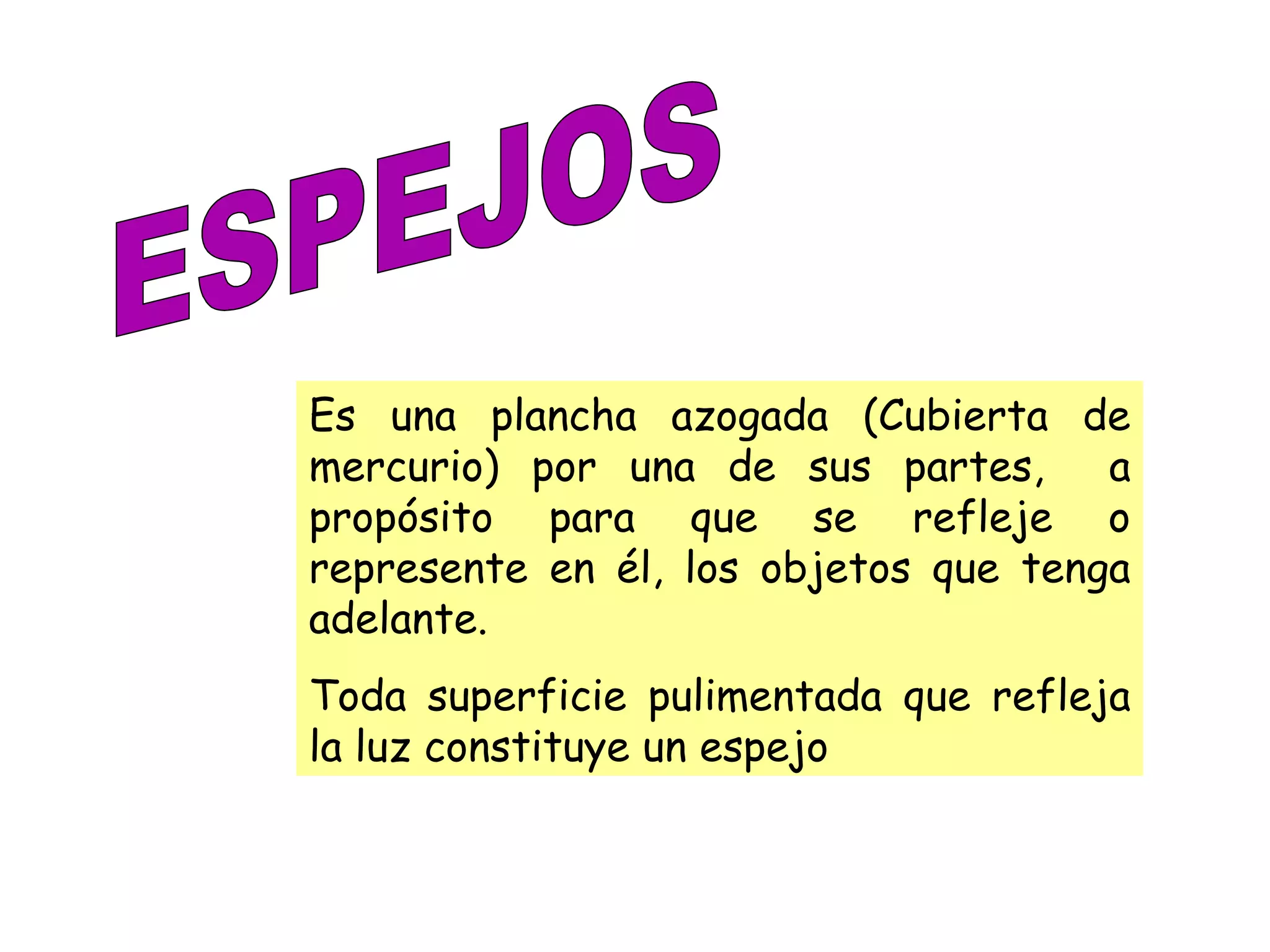 Un espejo es una superficie pulimentada que refleja la luz. Existen dos tipos principales de espejos: planos y curvos. Los espejos planos producen imágenes virtuales simétricas del mismo tamaño que el objeto, mientras que los espejos curvos (cóncavos o convexos) producen imágenes reales o virtuales dependiendo de la posición del objeto respecto al foco y la curvatura del espejo.