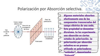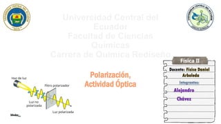Este documento trata sobre la polarización de la luz y la actividad óptica de compuestos quirales. Explica diferentes formas de polarización de la luz como la absorción selectiva, la reflexión y la ley de Brewster. También describe cómo la luz polarizada se transmite a través de compuestos quirales produciendo rotación, y las aplicaciones de medir esta rotación como identificar y cuantificar sustancias quirales. Finalmente, resume brevemente conceptos como quiralidad y cómo se mide la rotación óptica usando un polarímetro