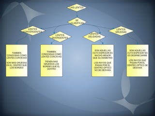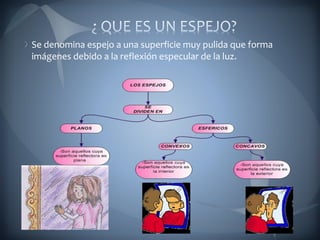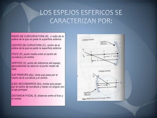 El documento habla sobre óptica, específicamente sobre lentes y espejos. Explica que un espejo es una superficie pulida que forma imágenes debido a la reflexión de la luz, y que las imágenes en espejos esféricos se pueden determinar usando diagramas de rayos. También describe qué son las lentes, su capacidad de refracción medida en dioptrías, y algunos defectos visuales como la miopía, hipermetropía y astigmatismo que se corrigen con diferentes tipos de lentes.