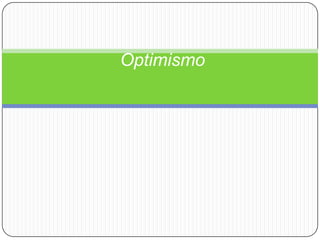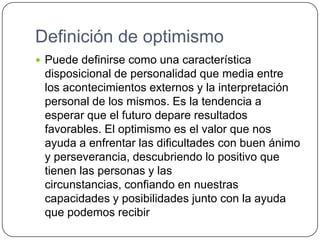 El documento define el optimismo como una característica de la personalidad que influye en cómo se interpretan los eventos externos de manera positiva, esperando resultados favorables. El optimismo mejora la salud física y mental, reduce los síntomas de depresión y ansiedad, y aumenta la longevidad. Aunque el optimismo puede ser innato, también se puede aprender y entrenar mediante el refuerzo de pensamientos y actitudes positivas.