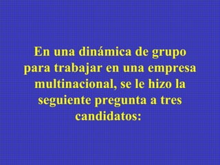 El documento presenta una dinámica de grupo en la que se le preguntó a tres candidatos qué les gustaría que dijeran en su velorio. Los dos primeros candidatos dieron respuestas convencionales sobre ser buenos padres y profesores. El tercer candidato respondió de manera más optimista, diciendo que le gustaría que dijeran "¡Mira, se está moviendo!", lo que demostró su perspectiva positiva. Como resultado de esta actitud optimista, el tercer candidato fue contratado para el puesto de trabajo.