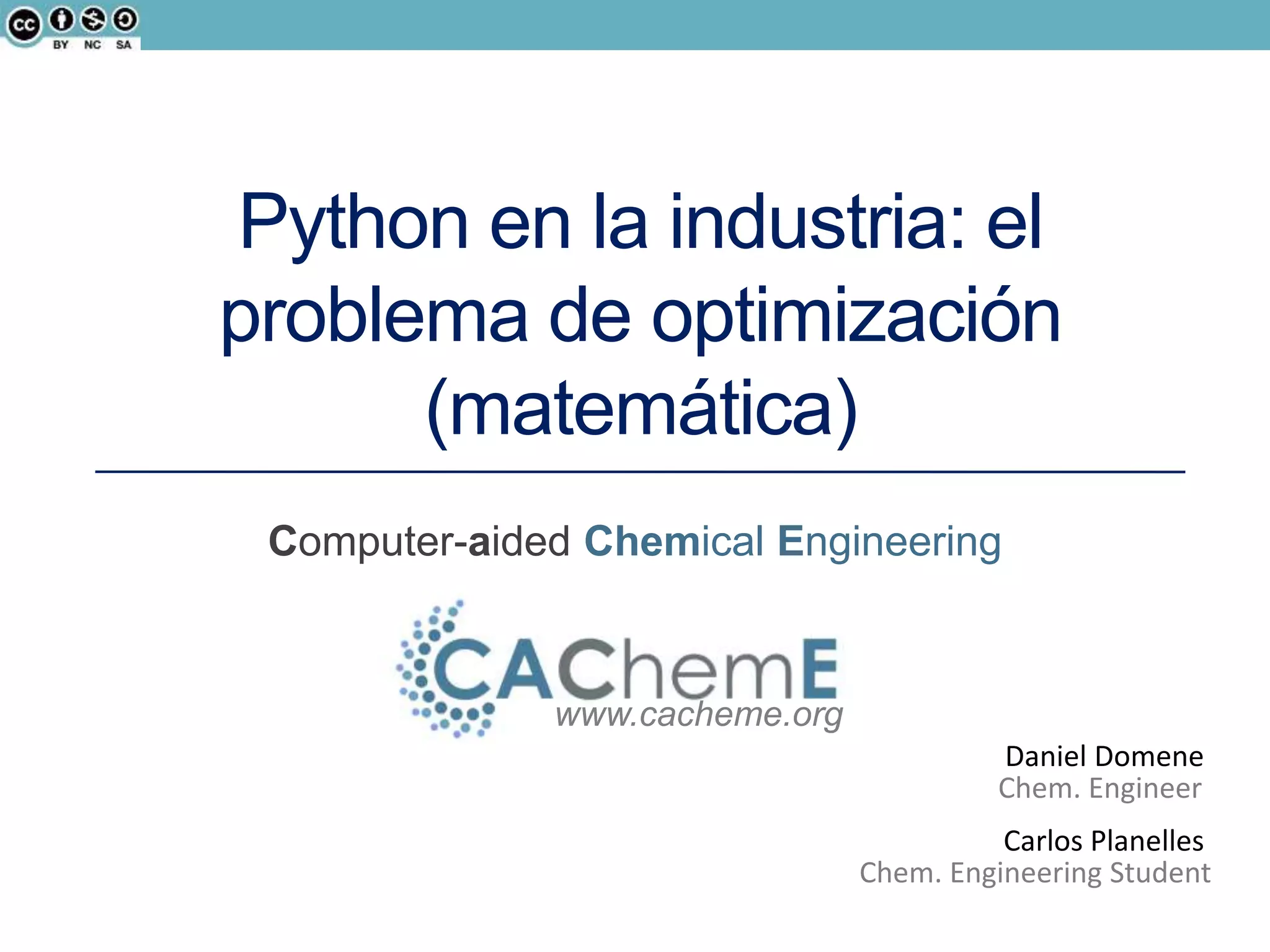 El documento aborda la optimización matemática en ingeniería química, centrándose en el uso de Python y herramientas como Pyomo para resolver diversos problemas de optimización, incluyendo programación lineal y no lineal. Se discute la importancia de la optimización para mejorar la calidad de productos, reducir costos y minimizar riesgos ambientales, y se presentan ejemplos prácticos de problemas de transporte y síntesis de procesos. Además, se detallan lenguajes de modelado algebraico y diferentes algoritmos utilizados en estos procesos.