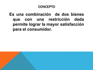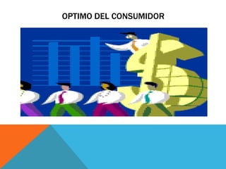 El documento describe el concepto de óptimo del consumidor, que es la combinación de bienes que maximiza la satisfacción del consumidor dado su presupuesto. Explica que hay dos condiciones: 1) el presupuesto es igual al gasto total, y 2) la tasa marginal de sustitución entre bienes es igual a la relación de sus precios. Proporciona un ejemplo numérico y explica cómo calcular los conjuntos límite de bienes que determinan la recta de presupuesto y el óptimo del consumidor.
