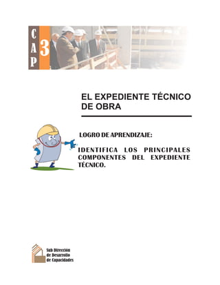 El expediente técnico es el conjunto de documentos técnicos y económicos necesarios para la ejecución de una obra e incluye la memoria descriptiva, planos, especificaciones técnicas y presupuesto. Puede ser elaborado por la entidad, un consultor externo o el contratista para obras bajo modalidad de concurso oferta o llave en mano. Contiene estudios básicos y específicos de la obra así como planos de ejecución que representan gráficamente los componentes físicos de la misma.