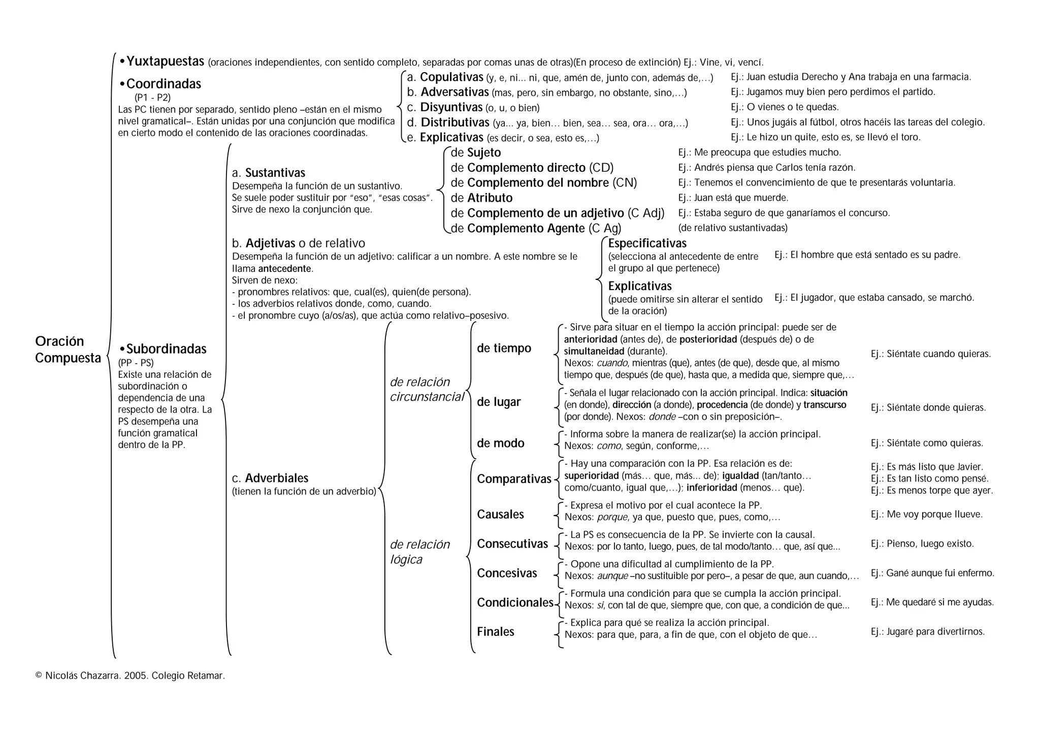 El documento describe las diferentes clases de oraciones compuestas, incluyendo oraciones coordinadas y subordinadas. Las oraciones coordinadas consisten en oraciones independientes unidas por conjunciones como "y", "pero", u "o". Las oraciones subordinadas tienen una relación de dependencia donde una oración sirve como función gramatical de la otra; ejemplos son las sustantivas, adjetivas, y adverbiales.