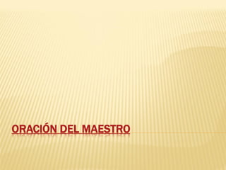 La oración del maestro pide sabiduría para educar a todos sus alumnos con autoridad y respeto, reconociendo la individualidad de cada estudiante y enseñándoles sobre sus deberes hacia los demás. También pide recordar que aunque la tarea de enseñar es difícil, ayudar a formar el futuro es muy gratificante y aceptar cuando comete errores para seguir mejorando.