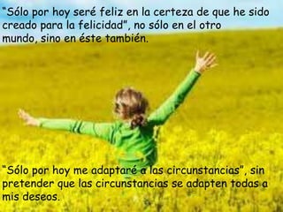 El documento presenta una serie de principios para vivir el día de manera positiva y enfocada, incluyendo tratar de vivir el día sin querer resolver todos los problemas de una vez, cuidar su apariencia y no criticar a otros, adaptarse a las circunstancias sin esperar que se adapten a sus deseos, dedicar tiempo a la lectura, hacer una buena acción sin decirle a nadie, hacer por lo menos una tarea no deseada, crear un plan para el día y no tener temores, particularmente al gozar de la belleza y creer en la bondad.