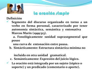 El documento define la oración y describe sus características. Define la oración como una unidad sintáctica, semántica y entonativa organizada en torno a un verbo personal. Explica que una oración está compuesta por un sujeto y un predicado, y describe diferentes tipos de oraciones según su actitud y reconocimiento del sujeto.