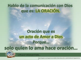 El documento presenta la buena noticia para todos, invitando a las personas a buscar a Dios. Incluye varias imágenes que ilustran actitudes de oración y fe. Finalmente, desafía al lector a empezar a buscar a Dios ese mismo día, pues Él esperará pero no para siempre.