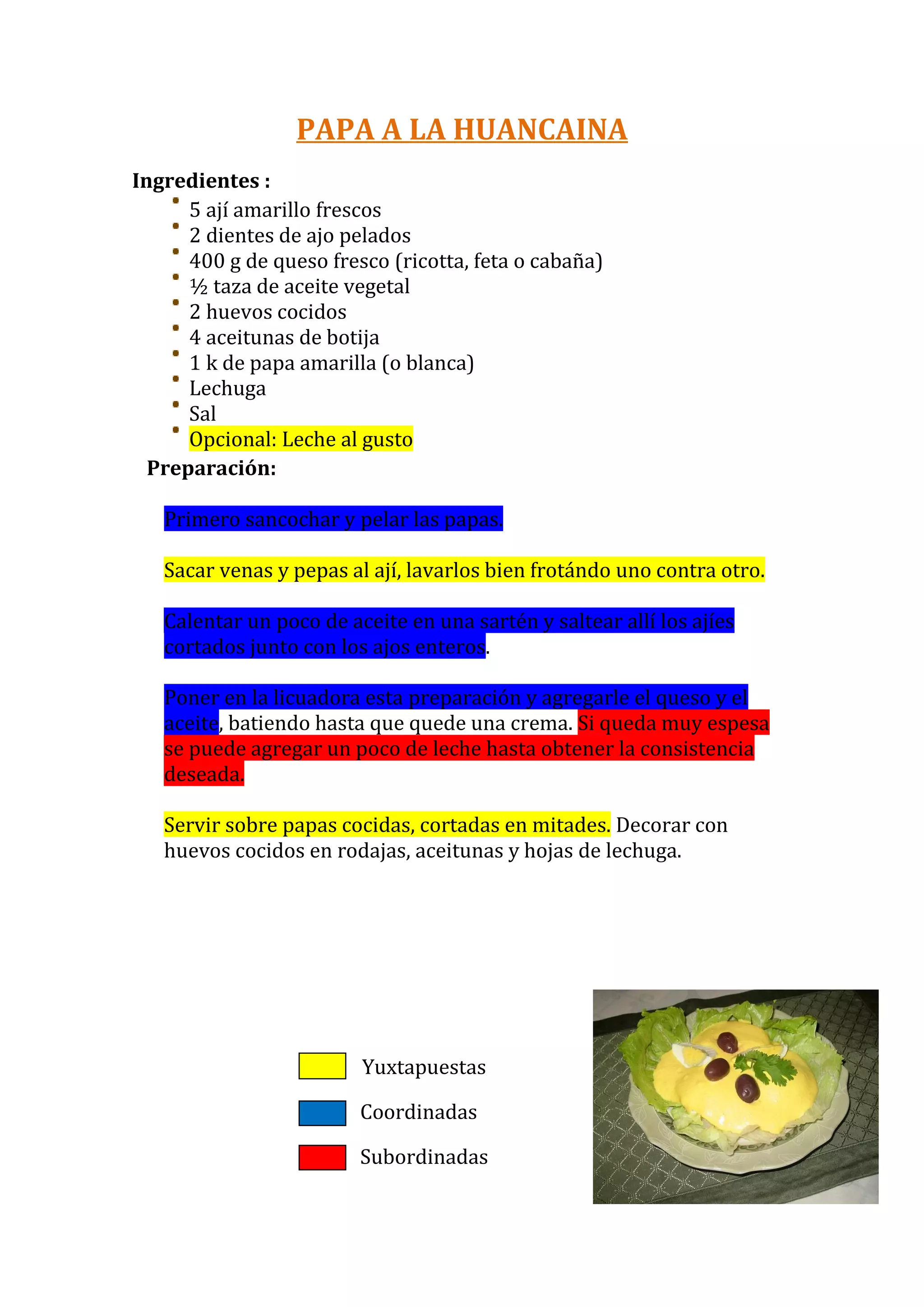 Este resumen describe los pasos para preparar la receta de papa a la huancaina, un plato típico peruano. Primero, se sancochan y pelan las papas. Luego, se saltean los ajíes amarillos junto con los ajos para preparar una crema con queso y aceite. Finalmente, se sirven las papas cocidas decoradas con la crema de ají, huevos cocidos y aceitunas.