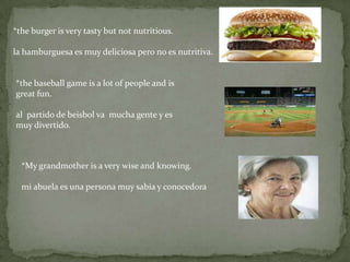 El documento habla sobre varias cosas que son agradables pero no siempre nutritivas como el helado y las hamburguesas, y también sobre actividades que mantienen el cuerpo sano como el ejercicio y que son divertidas como los partidos de beisbol. Además, menciona lugares hermosos como las montañas y torres altas y famosas, y personas sabias como las abuelas.