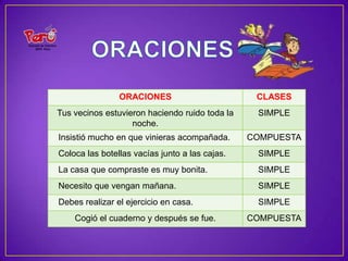 El documento presenta una clase sobre las diferentes clases de oraciones. Explica que las oraciones se pueden dividir en simples o compuestas. Luego describe las clases de oraciones compuestas, incluyendo oraciones compuestas coordinadas, oraciones compuestas subordinadas y oraciones compuestas por yuxtaposición. Finalmente, distingue entre oraciones compuestas coordinadas y subordinadas, señalando que las coordinadas no dependen una de la otra mientras que las subordinadas dependen de una oración principal.