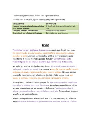 Este documento resume la experiencia de una persona que se perdió mientras caminaba y leía un libro. Después de correr y beber agua, no podía decidir si acompañaría a su madre a un cumpleaños o se quedaría en casa escuchando la radio. Mientras caminaba, se distrajo leyendo y se pasó de lugar. Caminó durante horas recordando momentos felices de su infancia hasta que reconoció el camino a casa y se reunió con su madre, decidiendo acompañarla.