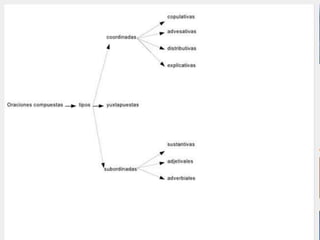 Las oraciones distributivas son un tipo de oraciones coordinadas que expresan acciones alternas utilizando conjunciones como "ya-ya", "uno-otro", "este-aquel", "bien-bien", "tan pronto-como". Pueden ser copulativas, relacionando oraciones opuestas que no se excluyen, o disyuntivas. Algunos ejemplos son "Uno estudia mientras el otro duerme", "Aquí no hay amor, allá tampoco", y "Ya vienen las vacaciones, ya viene la diversión".