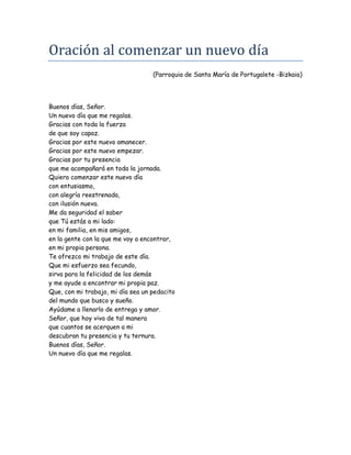 Este documento contiene varias oraciones dirigidas a Dios, Jesucristo y el Espíritu Santo para pedir guía, sabiduría, perdón y sanación. Incluye oraciones para el comienzo y final del día, para pedir discernimiento en la toma de decisiones, y para agradecer el don de la vida y pedir los dones del Espíritu Santo.