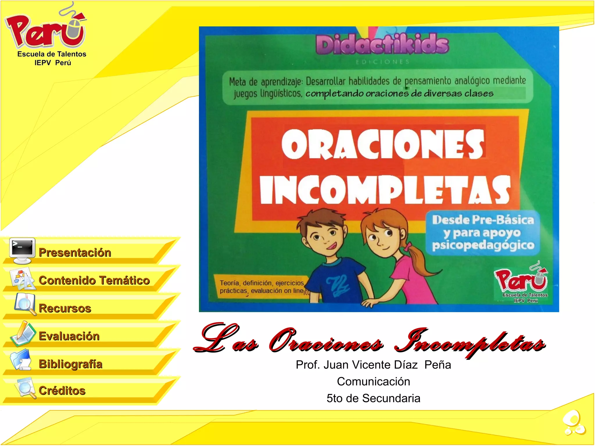 Este documento presenta la temática de las oraciones incompletas en 3 oraciones: 1) Explica qué son las oraciones incompletas y cómo se construyen, 2) Detalla la estructura y objetivos de este tipo de ejercicios, 3) Describe los criterios para resolver oraciones incompletas como coherencia, precisión léxica y sentido contextual.