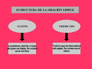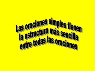 Las oraciones simples tienen la estructura más sencilla. En las oraciones activas el sujeto realiza la acción del verbo en voz activa, mientras que en las pasivas el sujeto recibe la acción del verbo en voz pasiva. Los verbos pronominales se conjugan con pronombres átonos y expresan acciones recíprocas entre dos o más seres u objetos.