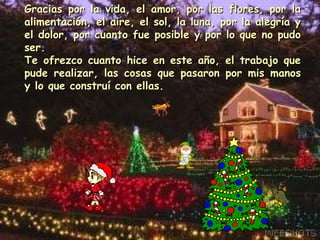 El autor le da gracias a Dios por todo lo recibido durante el año, incluyendo la vida, el amor y la naturaleza. Pide perdón por el tiempo perdido y las oportunidades desperdiciadas. Desea vivir el próximo año con optimismo, bondad y paz, derramando bendiciones a los demás.