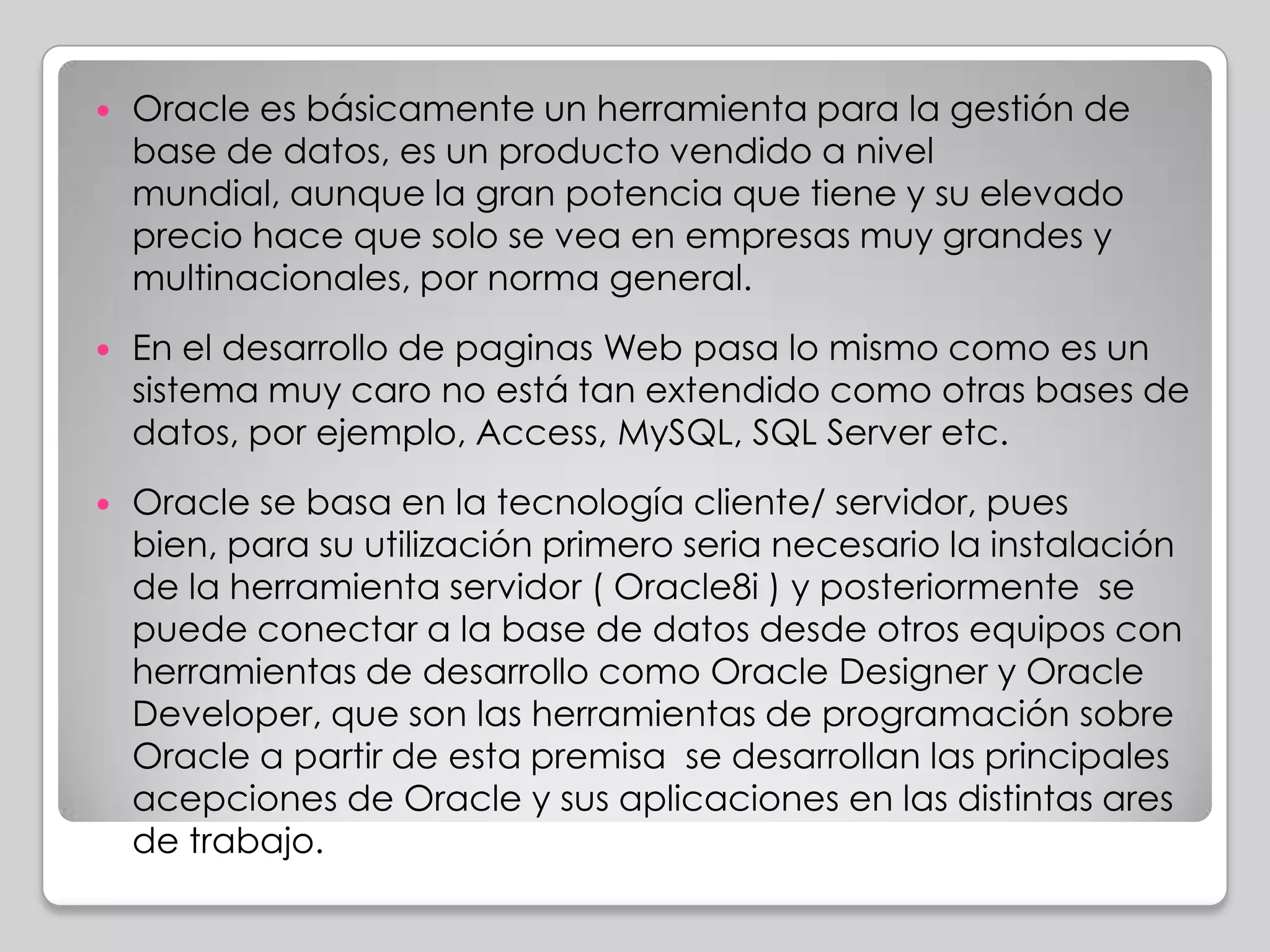 Oracle es una herramienta cliente/servidor para la gestión de bases de datos. Es un producto caro usado principalmente por grandes empresas. Su producto principal, Oracle7, es el líder mundial en bases de datos y continúa mejorando su tecnología para soportar más lenguajes y usuarios. Oracle también ofrece aplicaciones y soporte para diferentes industrias.