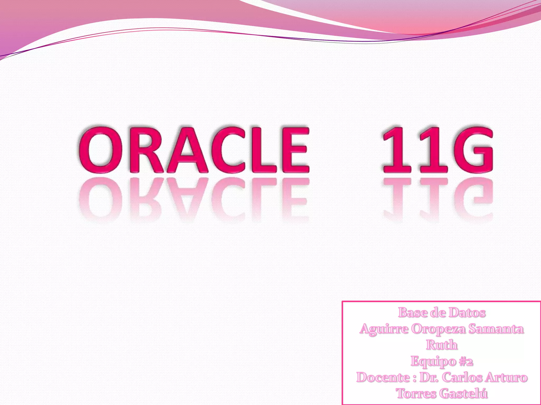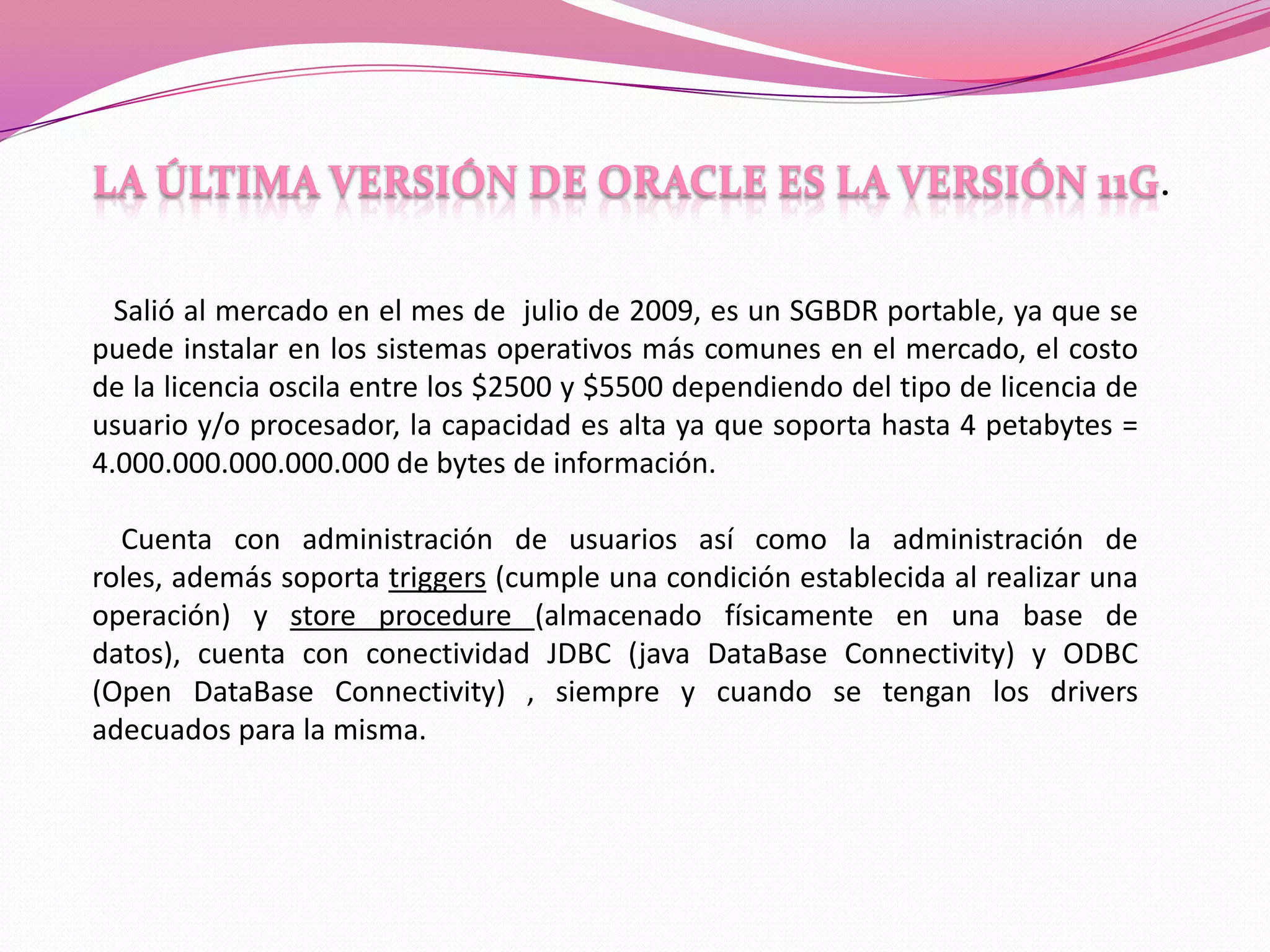 La última versión de Oracle es la 11g, lanzada en julio de 2009. Es un SGBDR portable y escalable que admite hasta 4 petabytes de datos e incluye características como administración de usuarios y roles, triggers, store procedures, y conectividad JDBC y ODBC. Oracle es un sistema de bases de datos seguro, confiable y ampliamente utilizado por empresas de telecomunicaciones en América Latina.