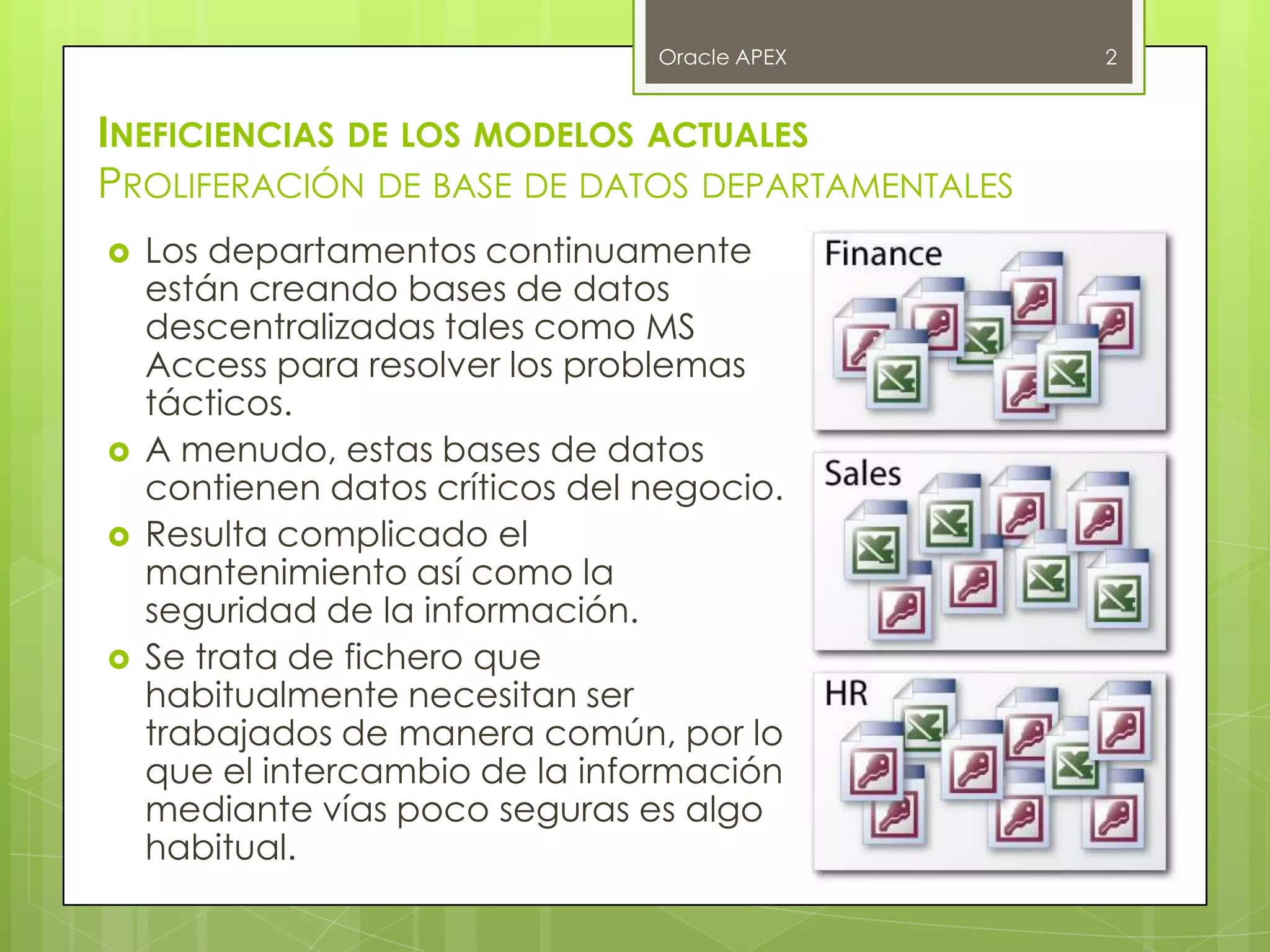 El documento describe las ineficiencias de los modelos de bases de datos departamentales descentralizadas y cómo Oracle APEX puede consolidar los datos y el desarrollo de aplicaciones de manera centralizada en Oracle Database 11g. APEX permite el desarrollo y gestión de aplicaciones web de manera segura y escalable, y puede implementarse de manera gratuita usando las versiones XE de Oracle Database y APEX.