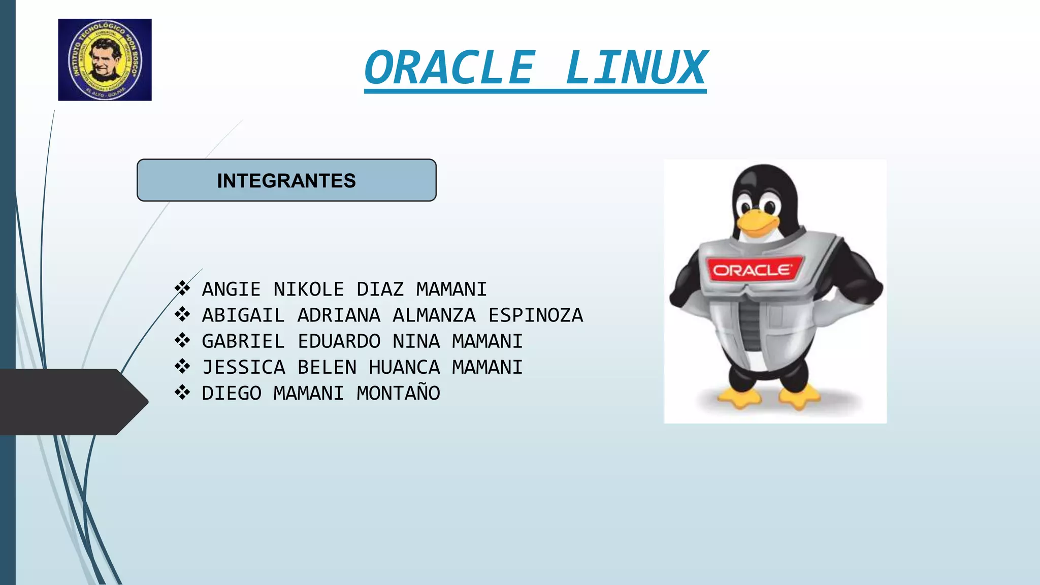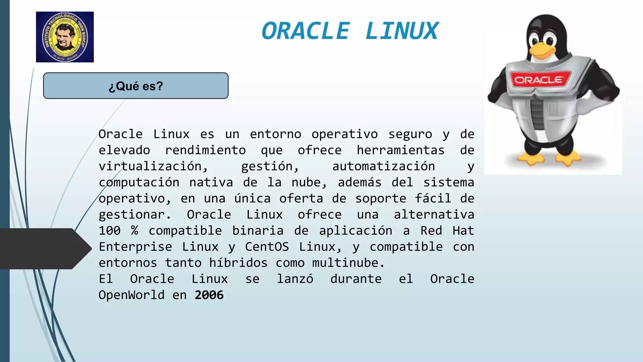 El documento describe la instalación de Oracle Linux en una máquina virtual usando VirtualBox. Explica los pasos de seleccionar el idioma, configurar el destino de instalación, establecer la contraseña del usuario root, configurar la red, seleccionar el software a instalar, crear un usuario adicional llamado "oracle", y comenzar la instalación.