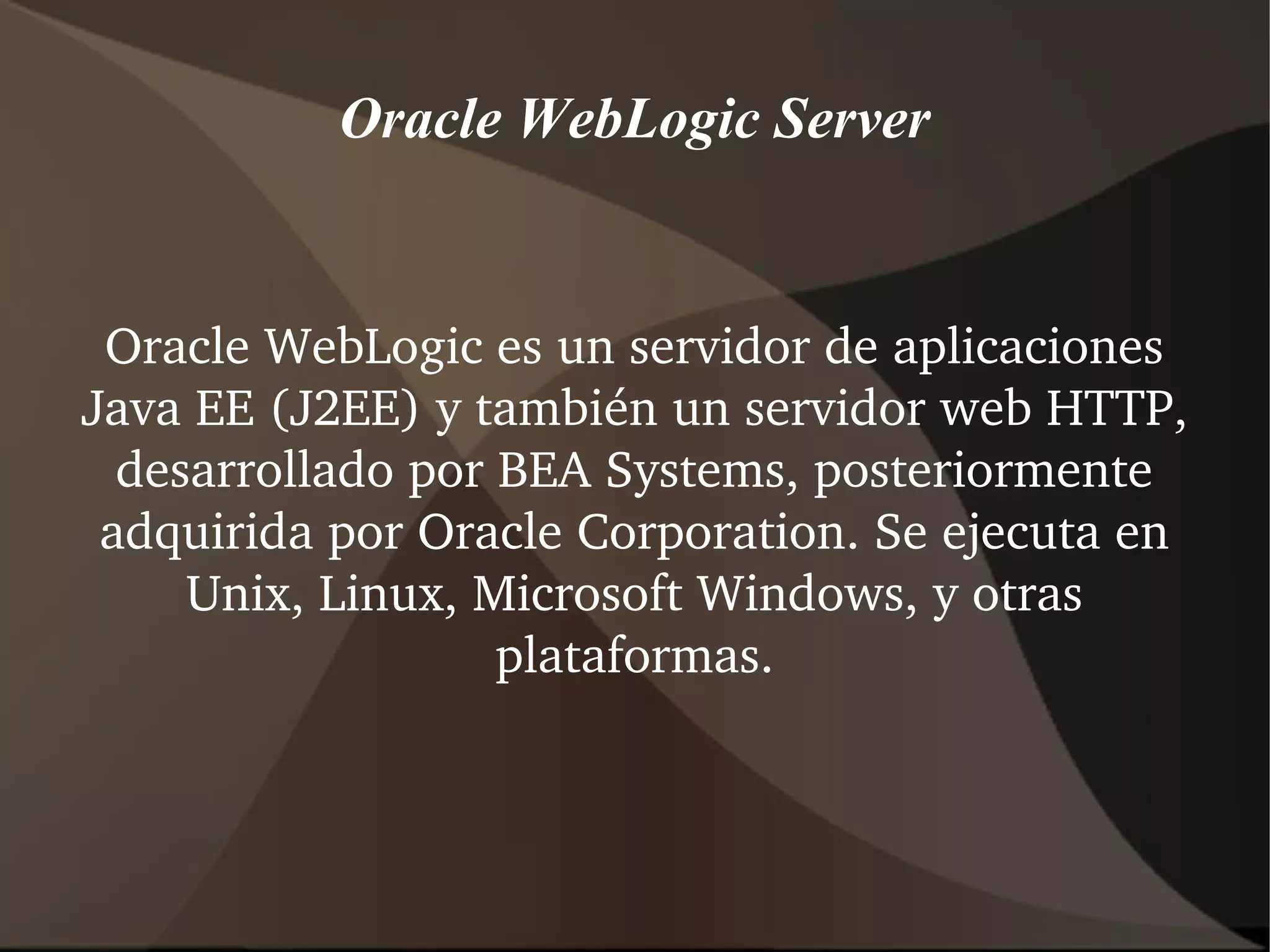 Oracle WebLogic Server es un servidor de aplicaciones Java EE y HTTP que permite la implementación de aplicaciones distribuidas en diversas plataformas. Forma parte de la Oracle WebLogic Platform, que incluye herramientas para el desarrollo y la integración de aplicaciones. Además, ofrece capacidades de seguridad y mensajería, y es fundamental para la infraestructura de aplicaciones en la nube de Oracle.