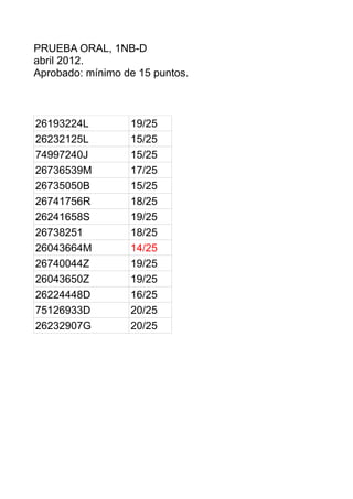 Este documento presenta los resultados de una prueba oral realizada en abril de 2012 para la obtención de un título. Se muestran los números de identificación y las calificaciones de 14 estudiantes, donde la nota mínima para aprobar era 15 puntos. La mayoría de los estudiantes lograron la calificación mínima requerida o superaron ese puntaje.