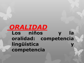 El documento habla sobre el desarrollo del lenguaje en los niños. Explica que entre los 3 primeros años de vida, los niños adquieren la competencia lingüística, que es el conocimiento de la lengua. También desarrollan la competencia comunicacional, que es la habilidad para intercambiar significados de manera adecuada a través del habla. Se enfatiza la importancia de estimular la oralidad en la educación inicial a través de actividades lúdicas que fomenten el aprendizaje significativo.