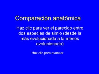 El documento compara la anatomía de dos especies de simios, mostrando las similitudes y diferencias entre la especie más evolucionada y la menos evolucionada. Al hacer clic en la presentación, se muestran las características anatómicas de cada especie y cómo varían entre ellas.