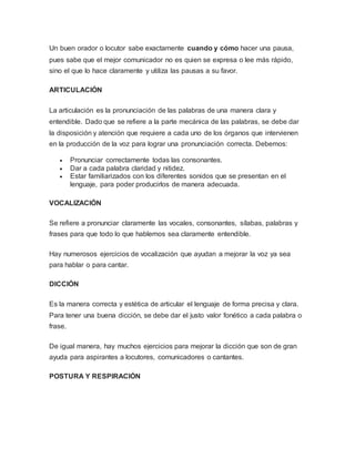 El documento proporciona consejos para mejorar la pronunciación, las pausas, la articulación y otros aspectos de la voz para convertirse en un buen orador. Recomienda ejercicios para mejorar la dicción, la respiración diafragmática y la postura. Además, enfatiza la importancia de la práctica constante para lograr una buena técnica vocal.
