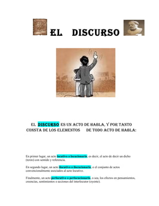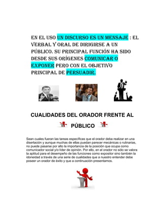 El documento resume las características fundamentales de un discurso. En primer lugar, explica que un discurso consta de tres elementos: un acto locutivo, ilocutivo y perlocutivo. Luego, define un discurso como un mensaje verbal y oral dirigido a un público con el objetivo principal de persuadir. Finalmente, enumera algunas cualidades físicas, intelectuales y morales que debe poseer un orador exitoso frente a un público.
