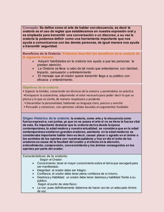 Este documento define la oratoria jurídica y sus elementos. Explica que la oratoria es el arte de hablar con elocuencia y es una herramienta para comunicarse y transmitir mensajes de manera efectiva. Luego, describe los beneficios de la oratoria para los abogados, incluyendo mejorar la comunicación, pensamiento estratégico y seguridad; lo que los ayuda a ser más eficaces en la defensa de sus clientes. Finalmente, concluye que los abogados deben esforzarse por dominar las reglas de la oratoria para su