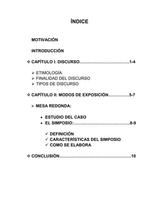 Este documento trata sobre los tipos de discurso. Explica que el discurso es un mensaje oral dirigido a un público con el objetivo de persuadir. Describe los diferentes tipos de discurso como el informativo, de explicación, descripción, definición y exposición. También habla sobre el discurso para motivar a la acción, de introducción y de aceptación, detallando las características y objetivos de cada uno.