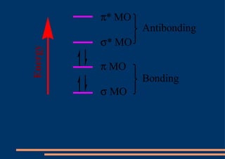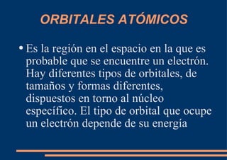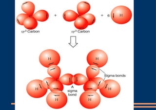 El documento describe los diferentes tipos de orbitales atómicos y orbitales moleculares, así como los conceptos de hibridación sp3, sp2 y sp. La hibridación sp3 da como resultado orbitales híbridos orientados a 109.5° que forman la estructura tetraédrica del metano. La hibridación sp2 forma orbitales en un triángulo que dan la estructura planar del eteno, con un enlace pi formado por los orbitales p. La hibridación sp da como resultado orbitales en línea recta que forman el triple enlace lineal en el